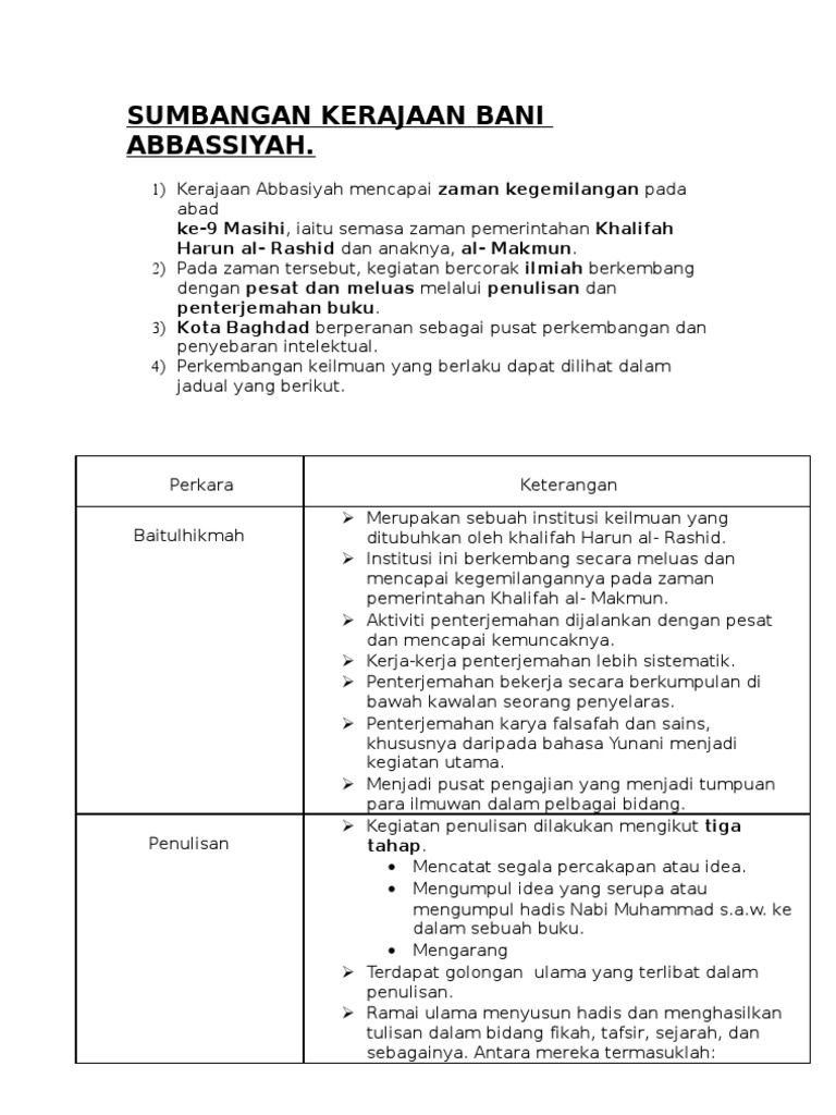 Kerajaan abbasiyah merupakan kesinambungan kepada kerajaan umaiyah. Para khalifah mengabaikan tanggungjawab terhadap rakyat. Tajuk ramalan sejarah 2 spm 2014. Pendahuluan kerajaan abbasiyah adalah kerajaan islam yang ketiga selepas khulafa' arrasyidin, dan klalifah umayyah. Latar belakang pemerintahan kerajaan abbasiyah :