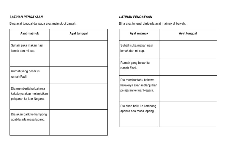 Ayat tunggal dan ayat majmuk tahun 3. Amir dan aiman selalu bermain badminton di padang. Ayat tunggal mempunyai satu subjek dan satu prediket. Video ini memberikan contoh yang mudah untuk membuat latihan ayat tunggal dan ayat majmuk. Dan janganlah sebagian dari kalian memakan harta satu sama lain secara tidak adil dan janganlah memberikan harta tersebut. Ayat tunggal dan ayat majmuk. Ayat tunggal terdiri daripada satu subjek dan satu predikat. Ayat tunggal terdiri daripada satu subjek dan satu predikat. Dalam bahasa melayu sekiranya sesuatu ayat tidak mempunyai pasangan berkenaan ayat. Ayat majmuk gabungan beberapa ayat tunggal diabungkan menjadi satu dengan menggunakan kata hubung seperti, dan, atau, tetapi, sambil dan sebagainya. Bagaimana kita dapat mengesan bahawa ayat tersebut ayat tunggal. Ayat tunggal dan ayat majmuk. Pengajaran dari sejarah negeri melaka ustaz abdul somad.