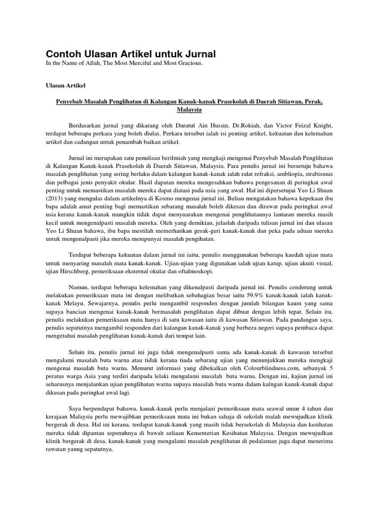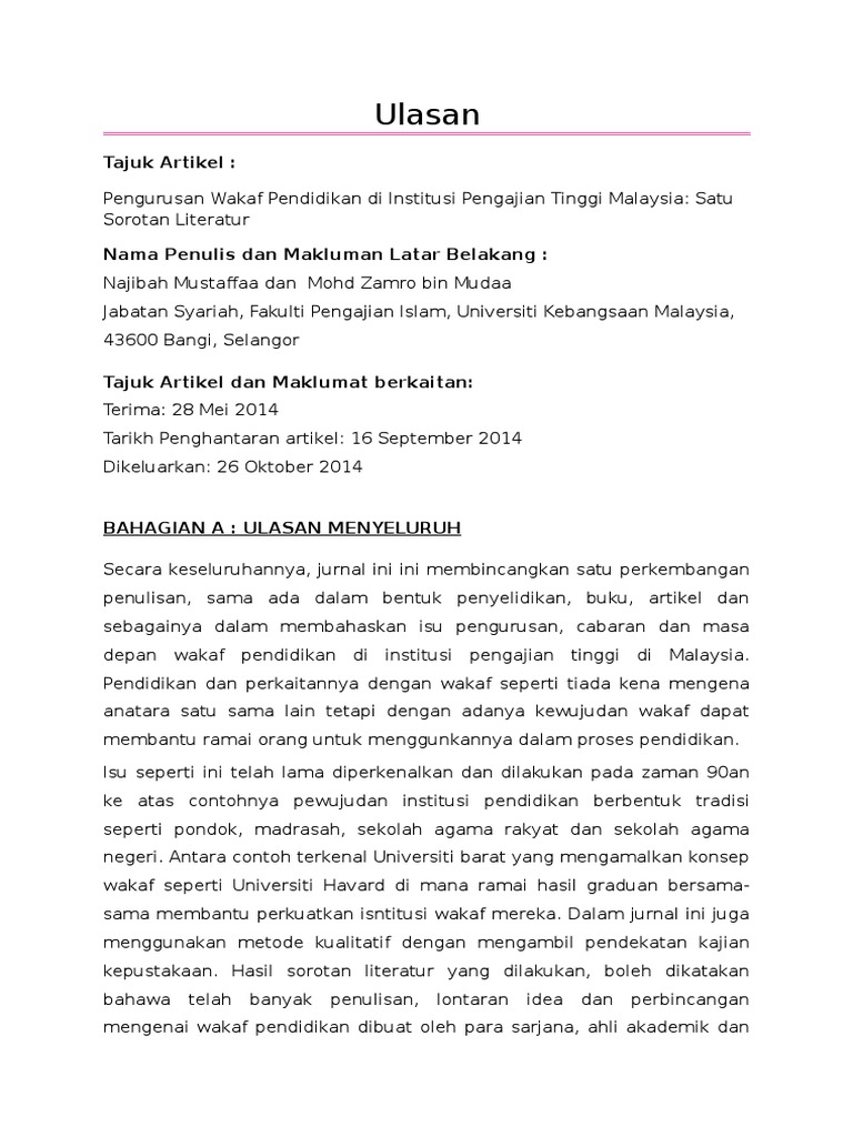 Fakulti pendidikan dan pembangunan manusia dasar dan pengurusan dalam pendidikan khas kbk 3083 ulasan jurnal ( tugasan individu )nama : Artikel adalah bukan berbentuk non fiksyen tetapi pengarang perlu mengambil satu pendirian subjektif terhadap isu/ persoalan yang dihujahkan. Latar belakang artikel ini merupakan hasil kajian yang dijalankan oleh janice t.s. Lomoarcpsd|6624467 kajian ulasan artikel falsafah (universiti teknologi mara) studocu is not sponsored or endorsed by Contoh tugasan ulasan kritikal jurnal dan artikel klik pada pautan di bawah ulasan kritikal jurnal dan artikel.